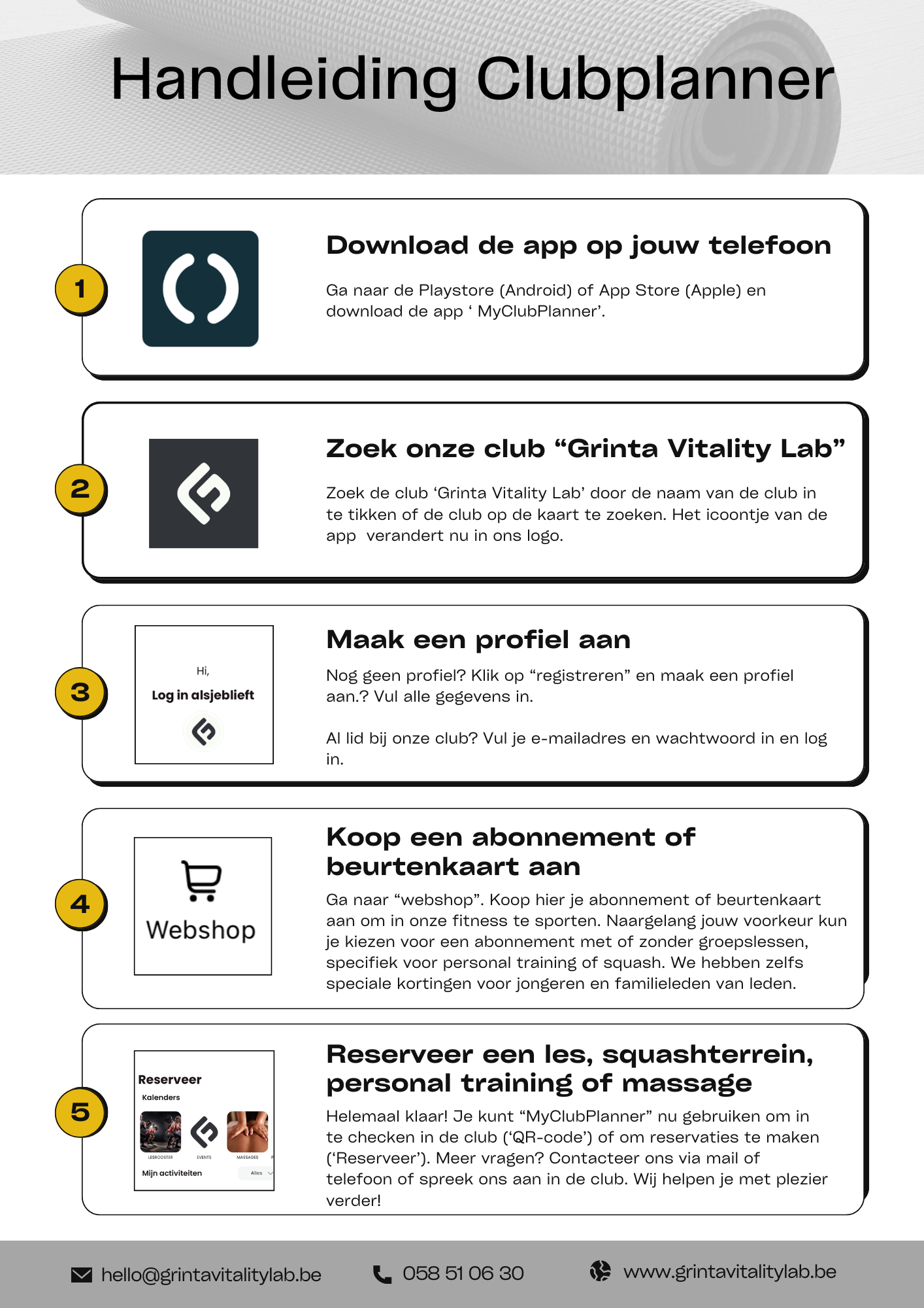 Bij Grinta Vitality Lab werken we met Clubplanner, een gebruiksvriendelijk online systeem waarmee jij als lid alles eenvoudig zelf kan beheren. Via Clubplanner kan je: